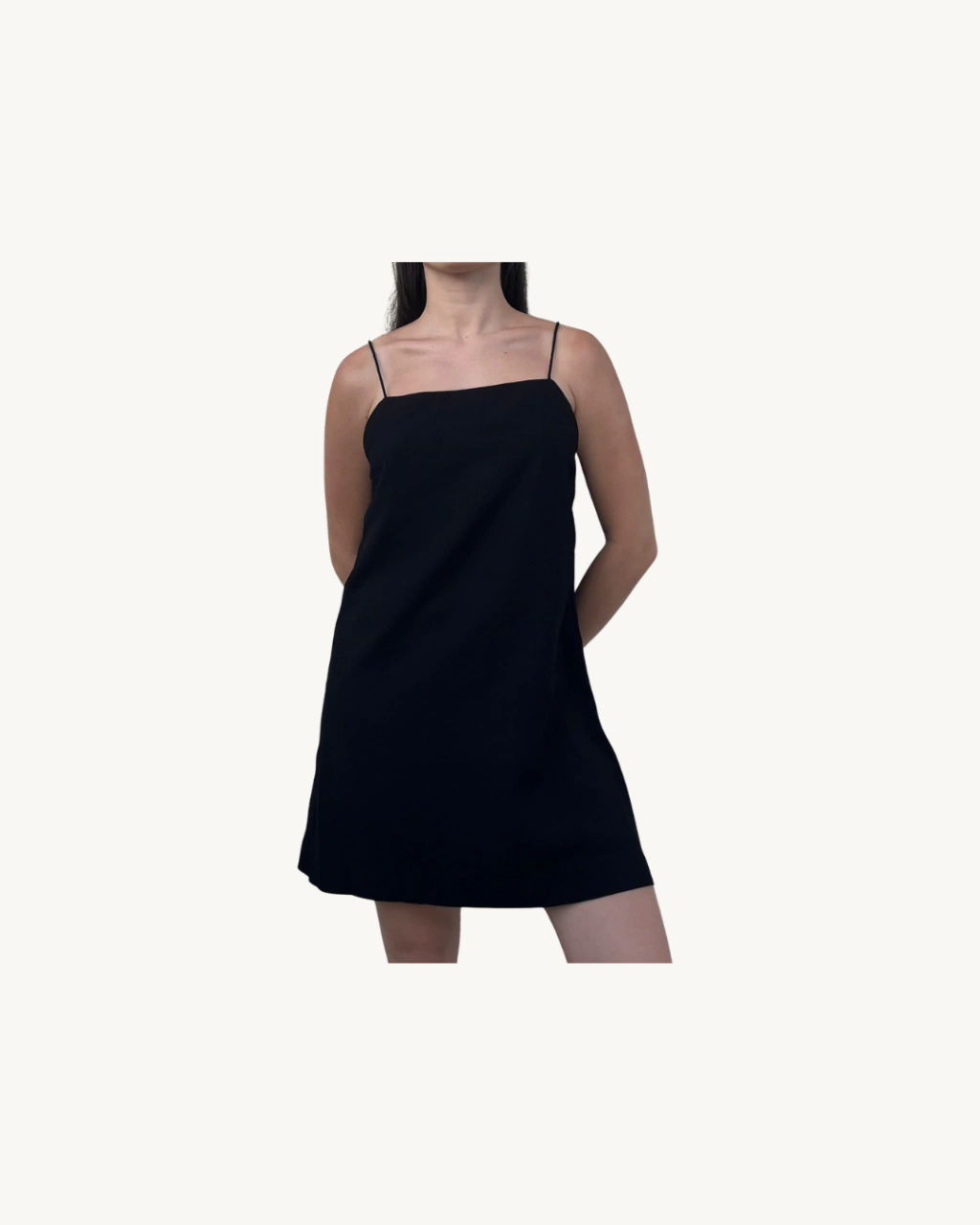 Vestido curto de alcinhas finas torcidas, com decote reto minimalista e modelagem levemente evasê. Em tecido leve e estruturado na medida certa, ele desenha o corpo sem marcar, criando um caimento fluido que acompanha os movimentos com naturalidade. Um clássico contemporâneo que funciona em diferentes corpos e ocasiões.